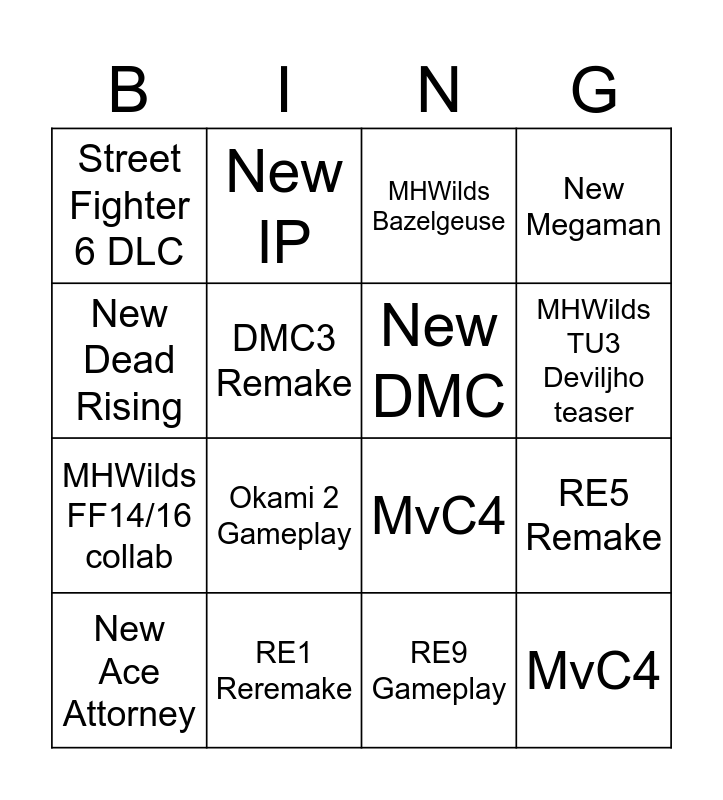 This bingo card has 17 words: RE9 Gameplay, New Ace Attorney, MHWilds Bazelgeuse, Street Fighter 6 DLC, Okami 2 Gameplay, New Megaman, RE5 Remake, New DMC, MHWilds TU3 Deviljho teaser, DMC3 Remake, RE1 Reremake, MvC4, New Dead Rising, New IP, MHWilds FF14/16 collab, Banjo Kazooie by Capcom and MvC4.