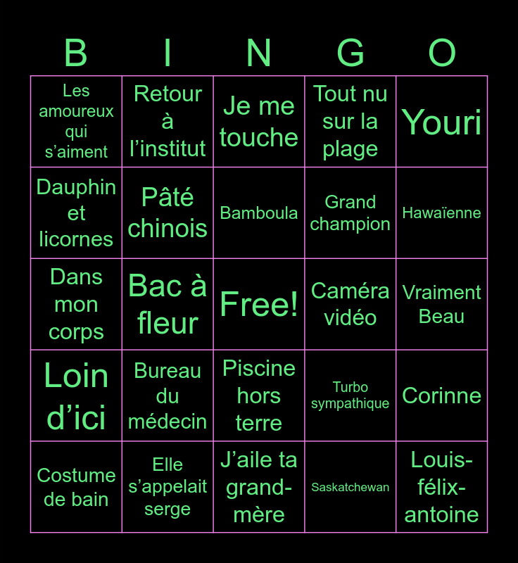 This bingo card has a free space and 28 words: Corinne, Ouvre tes yeux simon, Grand champion, Saskatchewan, Dauphin et licornes, Je me touche, Retour à l’institut, Loin d’ici, Caméra vidéo, Costume de bain, Dans mon corps, Tout nu sur la plage, Elle s’appelait serge, J’aile ta grand-mère, Hawaïenne, Vol à l’étalage, Bureau du médecin, Pâté chinois, Bamboula, Piscine hors terre, Les amoureux qui s’aiment, Rebecca, Louis-félix-antoine, Bac à fleur, Vraiment Beau, Turbo sympathique, Youri and Nuit de la poésie.
