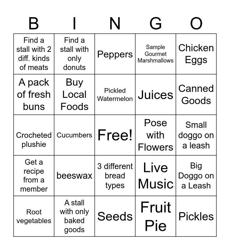 This bingo card has a free space and 86 words: Pink Canopy, MFM Tshirt, 3 different bread types, farm fresh chocolate milk, Fancy Decorated Cookie, 3 different kinds of microgreens, Fresh kuchen, Infused Honey, Boba Tea Drink, kombucha, Cinnamon Rolls, Oxtail, Big Doggo on a Leash, Small doggo on a leash, Get a Farmers Market Sticker, Pickled Watermelon, 3 different kinds of Salsa, Spicy Pickles, Buddy Chow, Pet Treats, Churros, Cotton Candy, Crocheted plushie, 10 minute walk through the park #MarketMovers, Fruit Pie, Macaroons, Handmade scrubbie, Lefse, Iced Drink, Handmade candles, A stall with only baked goods, Baskets, Beans, beeswax, A pack of fresh buns, Freeze Dried Fruit, Canned Goods, Coffee, Crafts, Cucumbers, Dessert Delicacies, Duck Eggs, Find Fermented foods, Pose with Flowers, Ice Cold Beverage, Chicken Eggs, Bring a friend to Market, Find a stall with only donuts, Buy 1 bag of Greens, Handcrafted Jewelry, Handmade Rugs, A Happy Customer, Get a recipe from a member, A booth with fresh Herbs, Try Gourmet Popcorn, Honey, Jams, Juices, Sample Gourmet Marshmallows, Buy Local Foods, Find a stall with 2 diff. kinds of meats, Natural, Nutrition, Opening Soon, Pastries, Peppers, Pickled, Pickles, Planting, Poultry, Produce, Pumpkins, Root vegetables, Salsas, Sausages, Seasonal, Seeds, Smiles, Soap, Spices, Squash, See a MFM Tote Bag, Tomatoes, 5 different kinds of produce at 1 stall, Live Music and Wine.