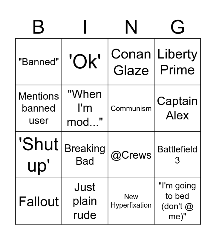 This bingo card has 19 words: @Crews, Stating the obvious, Conan Glaze, "I'm going to bed (don't @ me)", Battlefield 3, Mentions banned user, New Hyperfixation, "Banned", 'Ok', 'Shut up', Breaking Bad, "When I'm mod...", Communism, Just plain rude, Fallout, Buying Sweeties, Liberty Prime, Captain Alex and "I'm not a big fan of...:.