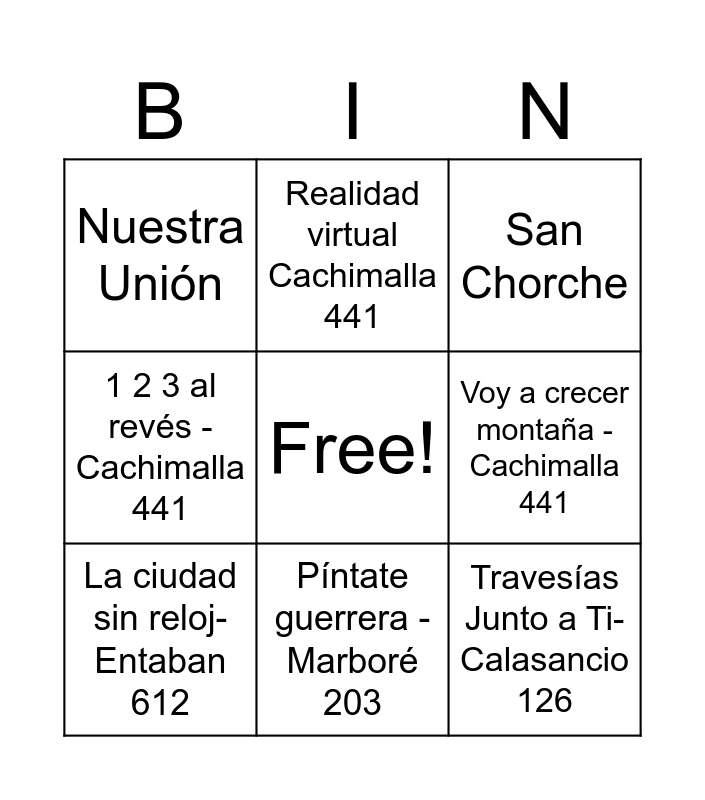 This bingo card has a free space and 28 words: Voy a crecer montaña - Cachimalla 441, Voy a crecer montaña - Cachimalla 441, San Chorche, Voy a crecer montaña -Cachimalla 441, Voy a crecer montaña - Cachimalla 441, San Chorche, Realidad virtual Cachimalla 441, 40 -Cachimalla 441, Gota a gota -Cachimalla 441, 15 días - Cachimalla 441, Mi definición de amigo - Cachimalla 441, 1 2 3 al revés - Cachimalla 441, 15 días - Cachimalla 441, Nuestro Aullar, Aliento de Vida-Okapi 465, Mil historias- Okapi 465, La voz de la montaña, La ciudad sin reloj- Entaban 612, Píntate guerrera - Marboré 203, Mil Recuerdos Por Vivir- Calasancio 126, Nuestra Unión, Travesías Junto A Ti- Calasancio 126, Alma De Caballero- Calasancio 126, Fotos En Blanco Y Negro- Calasancio 126, A Dormir- Calasancio, Nuestra Música- Okapi 465, Travesías Junto a Ti- Calasancio 126 and Súbete a la ola - Cachimalla 441.
