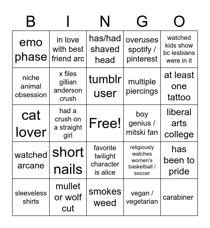 This bingo card has a free space and 24 words: short nails, mullet or wolf cut, tumblr user, sleeveless shirts, watched kids show bc lesbians were in it, emo phase, niche animal obsession, in love with best friend arc, boy genius / mitski fan, favorite twilight character is alice, multiple piercings, cat lover, religiously watches women's basketball / soccer, has been to pride, x files gillian anderson crush, vegan / vegetarian, liberal arts college, has/had shaved head, at least one tattoo, had a crush on a straight girl, carabiner, watched arcane, overuses spotify / pinterest and smokes weed.