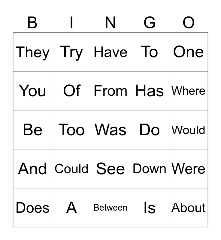 This bingo card has 59 words: Free!, A, The, And, Is, His, Of, As, Has, Two, To, Into, You, Your, I, They, Was, One, Said, From, Do, Have, Does, Were, Are, Who, What, When, Where, There, Here, Why, By, My, Try, Put, Very, Too, Also, Be, Should, Could, Would, Her, Over, Number, Say, Says, See, Between, Each, Many, Any, How, Now, Down, Out, About and Our.