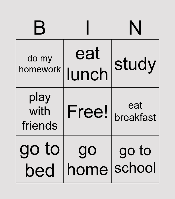 This bingo card has a free space and 12 words: get up, wash my face, go to school, eat breakfast, eat lunch, study, go home, eat dinner, do my homework, play with friends, go to bed and clean my room.