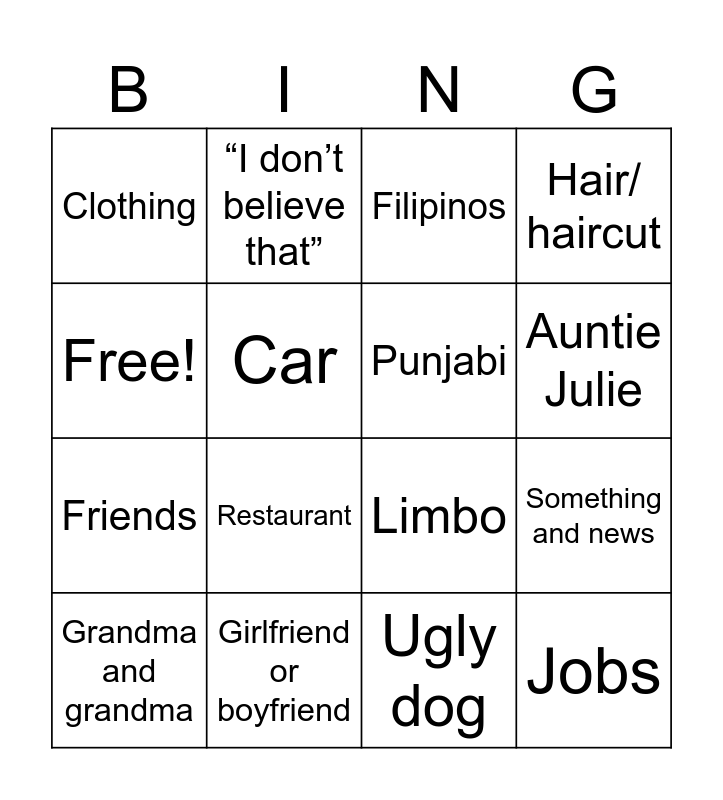 This bingo card has 16 words: Girlfriend or boyfriend, Something and news, Filipinos, Clothing, Friends, “I don’t believe that”, Limbo, Ugly dog, Free!, Car, Grandma and grandma, Hair/ haircut, Restaurant, Auntie Julie, Punjabi and Jobs.