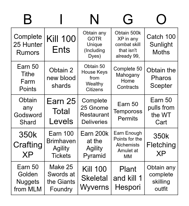 This bingo card has 25 words: Earn 100 Brimhaven Agility Tickets, Kill 100 Skeletal Wyverns, Obtain 50 House Keys from Wealthy Citizens, Earn 50 Golden Nuggets from MLM, Catch 100 Sunlight Moths, Complete 25 Hunter Rumors, Earn 50 Tithe Farm Points, Kill 100 Ents, Earn 50 Tempoross Permits, Earn 200k at the Agility Pyramid, Complete 50 Mahogany Home Contracts, Obtain any Godsword Shard, Earn Enough Points for the Alchemists Amulet at MM, 350k Fletching XP, Obtain 2 new blood shards, Obtain any complete skilling outfit, Earn 50 pulls from the WT Cart, Obtain any GOTR Unique (Including Dyes), Obtain the Pharos Scepter, Earn 25 Total Levels, Complete 25 Gnome Restaurant Deliveries, Make 25 Swords at the Giants Foundry, 350k Crafting XP, Obtain 500k XP in any combat skill that isn't already 99, and Plant and kill 1 Hespori.