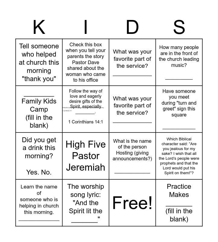 This bingo card has 1 images and 16 words: Learn the name of someone who is helping in church this morning. ______________, The worship song lyric: "And the Spirit lit the _______", What was your favorite part of the service? ____________, How many people are in the front of the church leading music? __________, ________ Family Kids Camp (fill in the blank), Check this box when you tell your parents the story Pastor Dave shared about the woman who came to his office, What is the name of the person Hosting (giving announcements?) _____________, Which Biblical character said: “Are you jealous for my sake? I wish that all the Lord’s people were prophets and that the Lord would put his Spirit on them!”?, Tell someone who helped at church this morning "thank you", Follow the way of love and eagerly desire gifts of the Spirit, especially ________. 1 Corinthians 14:1, Free!, Have someone you meet during "turn and greet" sign this square ____________, Did you get a drink this morning? Yes. No., High Five Pastor Jeremiah, What was your favorite part of the service? ____________ and Practice Makes _______ (fill in the blank).