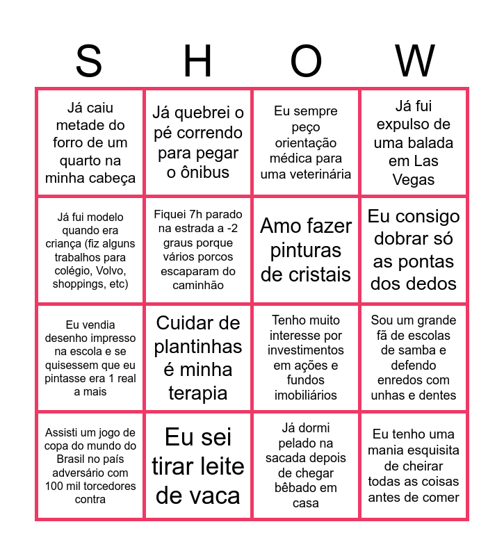 This bingo card has 1 images and 36 words: A cidade que eu moro é conhecida como a cidade do cacau, A minha primeira ida ao motel foi com a minha mãe, Amo fazer pinturas de cristais, Apertei a mão do Michael B Jordan em um evento, Assisti um jogo de copa do mundo do Brasil no país adversário com 100 mil torcedores contra, Cuidar de plantinhas é minha terapia, Eu comi cerol (vidro moído) quando tinha 11 anos, Eu consigo dobrar só as pontas dos dedos, Eu já quase morri afogado em uma enchente quando tinha 13 anos, Eu sei tirar leite de vaca, Eu sempre peço orientação médica para uma veterinária, Eu tenho uma mania esquisita de cheirar todas as coisas antes de comer, Eu vendia desenho impresso na escola e se quisessem que eu pintasse era 1 real a mais, Fiquei 7h parado na estrada a -2 graus porque vários porcos escaparam do caminhão, Fui vice campeão mundial em um esporte, Já atravessei a fronteira dos EUA de ônibus, Já caiu metade do forro de um quarto na minha cabeça, Já dei aula de capoeira infantil, Já dormi pelado na sacada depois de chegar bêbado em casa, Já fui expulso de uma balada em Las Vegas, Já fui modelo quando era criança (fiz alguns trabalhos para colégio, Volvo, shoppings, etc), Já ganhei um campeonato regional de boxe, Já me apresentei na escola com meus amigos, fui o vocalista do grupo de pagode que formamos, Já morei na praia por um ano, em Florianópolis, Já perdi um voo que seria 00:30, pois fui pro aeroporto só no dia seguinte, Já quebrei o pé correndo para pegar o ônibus, Já tirei foto numa festa como se fosse a Clarice Falcão, Lancei um curso digital e tive 25 alunos, Nunca quebrei um osso do corpo, Passei a mão na barriga do Dan Reynolds (vocalista do Imagine Dragons), Sou mecânico nas horas vagas, Sou um grande fã de escolas de samba e defendo enredos com unhas e dentes, Tenho alguns tics vocais e motores, e quando fico ansioso eles costumam aparecer de um jeito meio engraçado, Tenho CNH e não sei dirigir, Tenho muito interesse por investimentos em ações e fundos imobiliários and Toquei trompete por mais de 10 anos e abri até o show do Gilberto Gil.