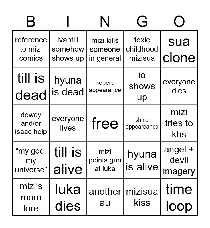 This bingo card has a free space and 24 words: till is alive, luka dies, heperu appearance, mizi’s mom lore, sua clone, reference to mizi comics, till is dead, ivantill somehow shows up, shine appeareance, mizi points gun at luka, io shows up, dewey and/or isaac help, hyuna is alive, angel + devil imagery, hyuna is dead, mizisua kiss, mizi tries to khs, mizi kills someone in general, everyone dies, everyone lives, time loop, “my god, my universe”, toxic childhood mizisua and another au.