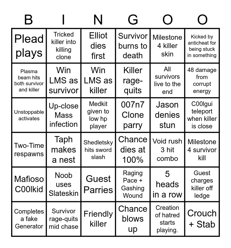 This bingo card has 36 words: Raging Pace + Gashing Wound, Guest Parries, Chance blows up, Plasma beam hits both survivor and killer, Two-Time respawns, 007n7 Clone parry, Win LMS as survivor, Friendly killer, Milestone 4 killer skin, 5 heads in a row, 48 damage from corrupt energy, Survivor burns to death, Guest charges killer off ledge, Up-close Mass infection, Killer rage-quits, Plead plays, Mafioso C00lkid, Jason denies stun, Unstoppable activates, Elliot dies first, Medkit given to low hp player, Taph makes a nest, Chance dies at 100%, Shedletsky hits sword slash, Void rush 3 hit combo, Tricked killer into killing clone, All survivors live to the end, Survivor rage-quits mid chase, Win LMS as killer, Kicked by anticheat for being stuck in something, Crouch + Stab, Completes a fake Generator, Milestone 4 survivor kill, C00lgui teleport when killer is close, Noob uses Slateskin and Creation of hatred starts playing..