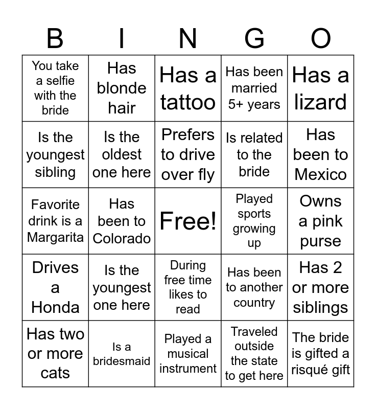 This bingo card has a free space and 28 words: Has 2 or more siblings, Is related to the groom, Is related to the bride, Traveled outside the state to get here, Is the youngest sibling, Has a tattoo, Has blonde hair, Drives a Honda, Played sports growing up, Has two or more cats, Favorite drink is a Margarita, Has been married 5+ years, Is a bridesmaid, Played a musical instrument, Has been to Mexico, Is a Sagittarius, Is the youngest one here, Is the oldest one here, Prefers to drive over fly, During free time likes to read, You take a selfie with the bride, The bride cries, The bride is gifted a risqué gift, Has been to Colorado, Owns a pink purse, Has been to another country, Has a lizard and Favorite color is pink.