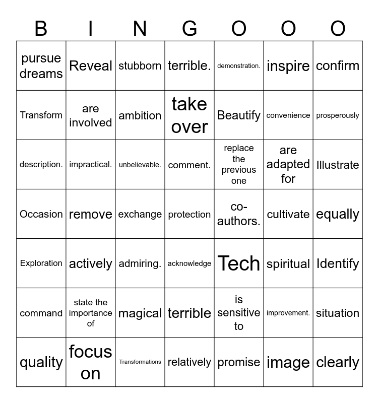 This bingo card has 65 words: Survival skills., Exploration, Ancestors’ hardships, are adapted for, co-authors., focus on, Reveal, diversity, Transform, Transformations, comment., improvement., description., demonstration., artistic skills, inspire, Beautify, pursue dreams, the appearance of, are involved, unbelievable., impractical., terrible., admiring., displays a notification, Identify, Tech, Detects, convenience, state the importance of, Illustrate, is sensitive to, distinguish, praise it highly, replace the previous one, Occasion, situation, take over, exchange, command, confirm, cultivate, prosperously, suspect, relatively, acknowledge, ambition, quality, protection, equally, promise, clearly, grateful, remove, force, apologize, terrible, stubborn, actively, spiritual, magical, willingly, strengthen, image and complexity.