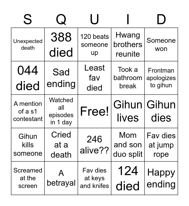 This bingo card has a free space and 24 words: Cried at a death, A betrayal, Least fav died, Screamed at the screen, Someone won, Unexpected death, 044 died, 388 died, Gihun lives, 246 alive??, Took a bathroom break, A mention of a s1 contestant, Mom and son duo split, Fav dies at jump rope, Sad ending, 124 died, Gihun dies, 120 beats someone up, Frontman apologizes to gihun, Watched all episodes in 1 day, Happy ending, Gihun kills someone, Hwang brothers reunite and Fav dies at keys and knifes.