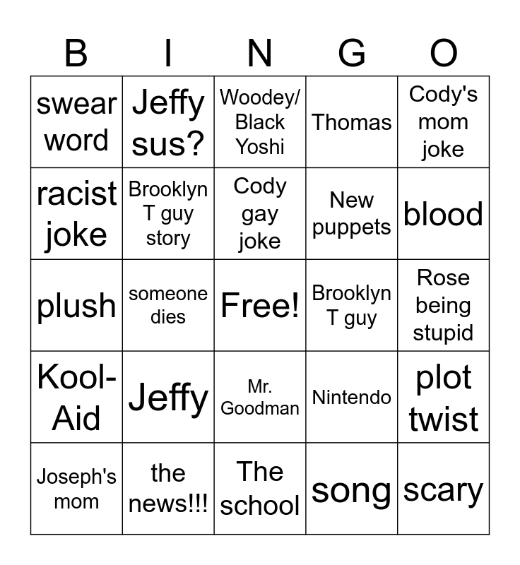 This bingo card has a free space and 24 words: Jeffy, the news!!!, Cody gay joke, Joseph's mom, Cody's mom joke, swear word, racist joke, Jeffy sus?, Brooklyn T guy, Mr. Goodman, New puppets, plush, Nintendo, plot twist, Brooklyn T guy story, song, Rose being stupid, Woodey/ Black Yoshi, blood, someone dies, scary, Kool-Aid, Thomas and The school.