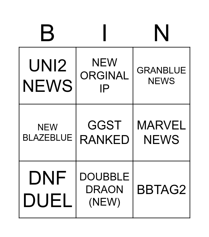 This bingo card has a free space and 8 words: MARVEL NEWS, GRANBLUE NEWS, NEW ORGINAL IP, DNF DUEL, UNI2 NEWS, BBTAG2, NEW BLAZEBLUE and DOUBBLE DRAON (NEW).