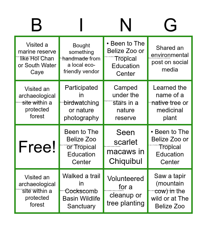 ⚠ This card has duplicate items: • Been to The Belize Zoo or Tropical Education Center (2), Visited an archaeological site within a protected forest (2)