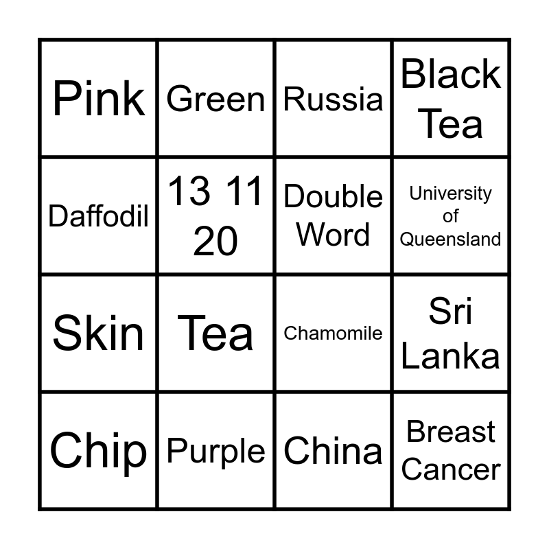 This bingo card has 19 words: Chamomile, SPF 50, Russia, Breast Cancer, Sri Lanka, Daffodil, China, Pink, Green, Skin, Tea, 13 11 20, Double Word, Purple, Chip, $578, Black Tea, University of Queensland and 1890's.
