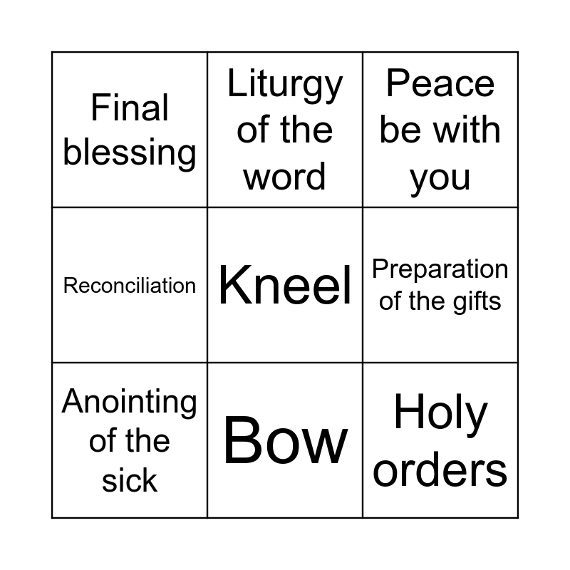 This bingo card has a free space and 19 words: Matrimony, Genuflect, Peace be with you, Lord's prayer, Sign of the cross, Holy orders, Baptism, Final blessing, Liturgy of the word, Liturgy of the Eucharist, Confirmation, Preparation of the gifts, Anointing of the sick, Sign of peace, Procession, Sing songs, Reconciliation, Bow and Eucharist.