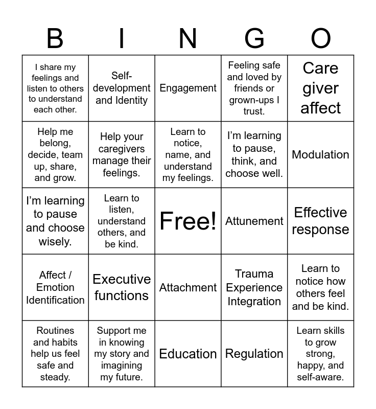 This bingo card has a free space and 31 words: Education, Routines and Rhythms, Learn to listen, understand others, and be kind., Competency, I share my feelings and listen to others to understand each other., Engagement, Help your caregivers manage their feelings., Trauma Experience Integration, Attunement, Regulation, Effective response, Learn skills to grow strong, happy, and self-aware., Relational Connection, Help me understand my feelings and see how strong I am., Modulation, I look at my past to know myself better., Learn to notice how others feel and be kind., Executive functions, Affect / Emotion Identification, Attachment, Care giver affect, Help caregivers respond with kindness and fairness., Routines and habits help us feel safe and steady., Self- development and Identity, I’m learning to pause, think, and choose well., Help me belong, decide, team up, share, and grow., Feeling safe and loved by friends or grown-ups I trust., I’m learning to pause and choose wisely., Support me in knowing my story and imagining my future., Learn to notice, name, and understand my feelings. and Teach me to regulate myself and express what I feel..