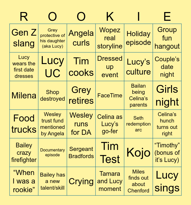 This bingo card has 36 words: Tim Test, Sergeant Bradfords, Tamara and Lucy moment, Lucy wears the first date dresses, Food trucks, FaceTime, Lucy UC, Crying, Holiday episode, Kojo, Couple’s date night, Wopez real storyline, “Timothy” (bonus of it’s Lucy), Shop destroyed, Dressed up event, Gen Z slang, Bailey crazy firefighter, Bailan being Celina’s parents, Milena, Angela curls, Grey retires, Wesley trust fund mentioned by Angela, Celina as Lucy’s go-fer, Wesley runs for DA, Seth redemption arc, Grey protective of his daughter (aka Lucy), Lucy’s culture, Bailey has a new talent/skill, Tim cooks, Group fun hangout, Lucy sings, “When I was a rookie”, Celina’s hunch turns out right, Girls night, Documentary episode and Miles finds out about Chenford.