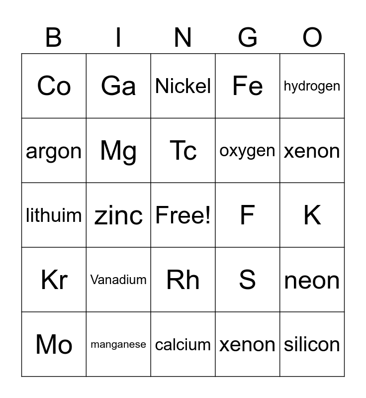This bingo card has a free space and 24 words: Vanadium, manganese, Tc, Mo, hydrogen, Co, argon, Ga, F, Rh, oxygen, lithuim, S, neon, Mg, xenon, K, Nickel, xenon, zinc, silicon, Kr, Fe and calcium.