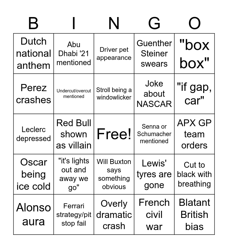 This bingo card has a free space and 24 words: "it's lights out and away we go", Ferrari strategy/pit stop fail, Stroll being a windowlicker, Alonso aura, "box box", Dutch national anthem, Perez crashes, Abu Dhabi '21 mentioned, Senna or Schumacher mentioned, Will Buxton says something obvious, Joke about NASCAR, Leclerc depressed, Lewis' tyres are gone, Cut to black with breathing, Undercut/overcut mentioned, French civil war, APX GP team orders, Driver pet appearance, "if gap, car", Red Bull shown as villain, Blatant British bias, Oscar being ice cold, Guenther Steiner swears and Overly dramatic crash.