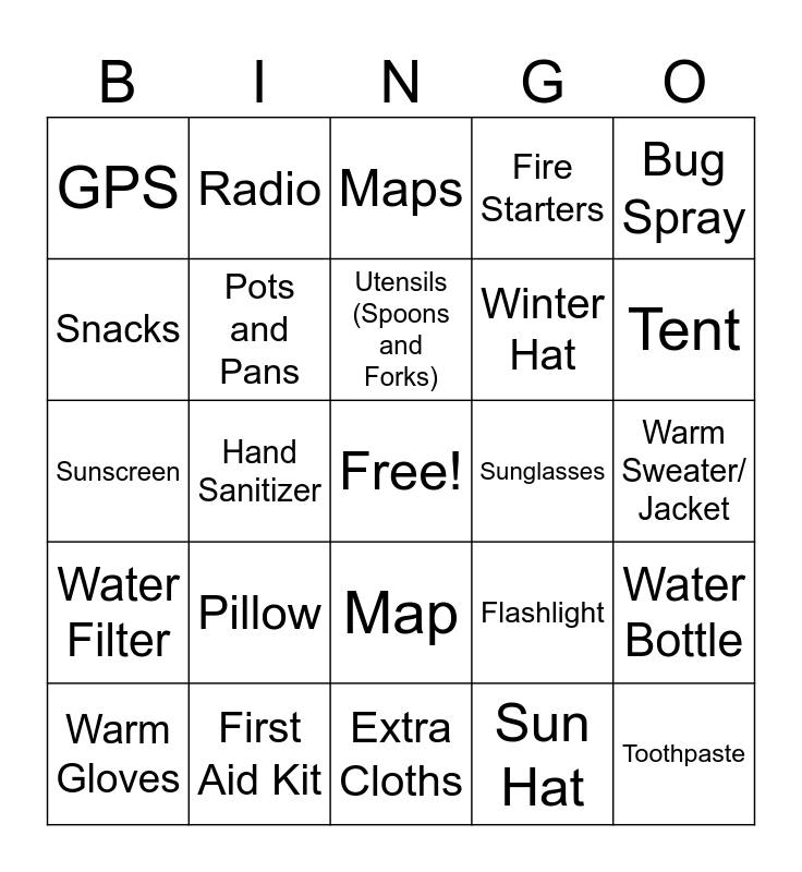 This bingo card has a free space and 28 words: Water Bottle, Fishing Rod, Winter Hat, Sun Hat, Snacks, Maps, Radio, Water Filter, Sunglasses, Warm Gloves, Sunscreen, Fire Starters, First Aid Kit, Extra Cloths, Tent, Sleeping Bag, Pillow, Pots and Pans, Utensils (Spoons and Forks), Map, GPS, Toothbrush, Toothpaste, Hand Sanitizer, Warm Sweater/ Jacket, Flashlight, Bug Spray and Camera.
