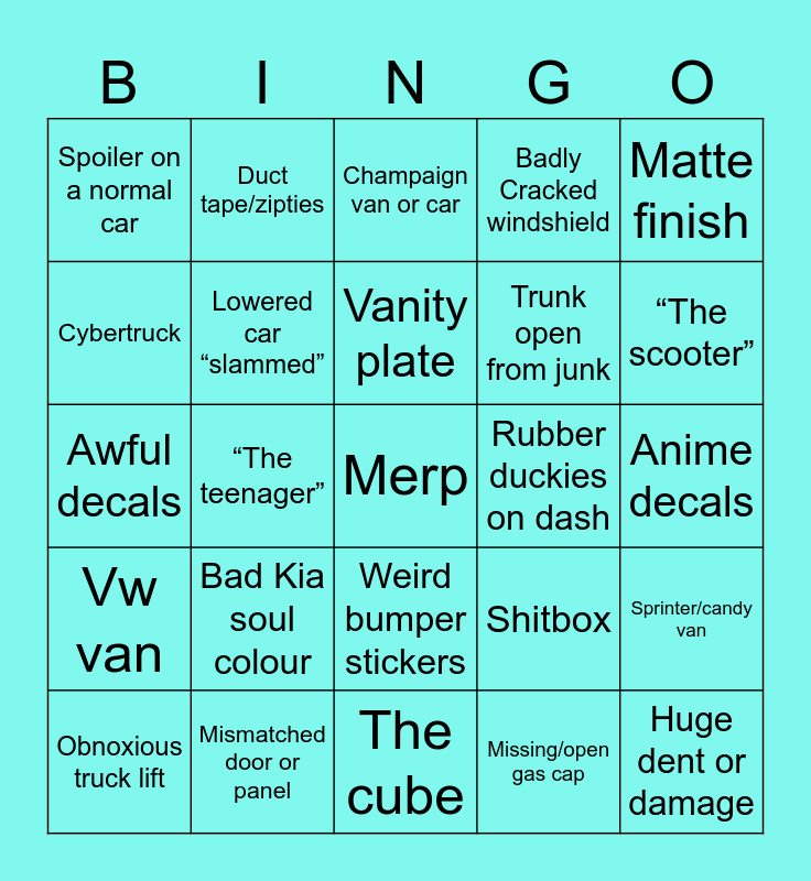 This bingo card has a free space and 24 words: Bad Kia soul colour, Mismatched door or panel, Vanity plate, Obnoxious truck lift, Matte finish, Spoiler on a normal car, Cybertruck, Duct tape/zipties, Rubber duckies on dash, Weird bumper stickers, Trunk open from junk, Awful decals, Shitbox, Sprinter/candy van, Lowered car “slammed”, Missing/open gas cap, Anime decals, Champaign van or car, “The scooter”, “The teenager”, Huge dent or damage, Vw van, Badly Cracked windshield and The cube.