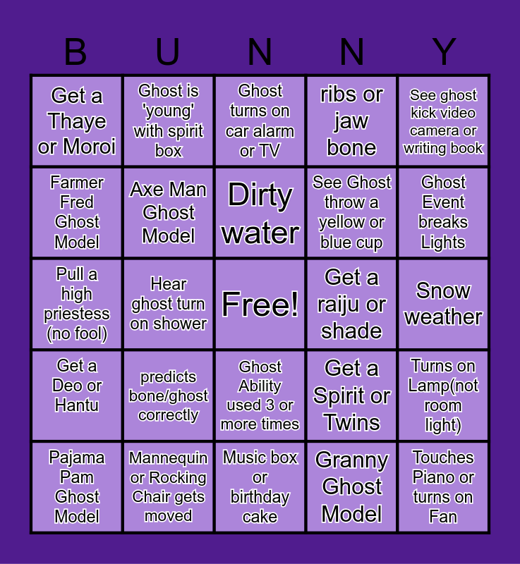 This bingo card has a free space and 69 words: Ghost knocks photo off wall, Snow weather, Foot or Hand bone, Same two cursed objects in a row, Mannequin or Rocking Chair gets moved, Pull a Death or Devil Tarot Card, ribs or jaw bone, Turns off power breaker 2 or more times, See ghost kick video camera or writing book, Changes favorite room 2 or more times, Turns on Lamp(not room light), Ghost sings 'Ring Around the Rosie', Get a Thaye or Moroi, Ghost turns on car alarm or TV, Get a Phantom or Oni, Hear ghost turn on shower, Ghost Ability used 3 or more times, See Ghost throw a yellow or blue cup, someone gets face full of ghost crotch, Get a Deo or Hantu, Get a raiju or shade, Get a Spirit or Twins, Ghost Event breaks Lights, Get a Polty or Banshee, Skull or Voldy's wand bone, Bone is in Utility Room or Garage, Someone unalives in anyway, Get a Demon or Yokai, Granny Ghost Model, Teddy Bear giggle or bear has no face, Ghost is 'young' with spirit box, Get a Mimic or Wraith, Hip or Femur bone, 'Red Light' Ghost Event, See ghost throw Spray Paint, Big Boy Butcher Ghost Model, Baseball Bat Boy Ghost Model, Get 2 stick shaped bones in arow, Farmer Fred Ghost Model, Ghost turns on Radio, predicts bone/ghost correctly, Touches Piano or turns on Fan, Nekkid Ned Ghost Model, Everyone guesses the wrong ghost, Onion Head Girl Ghost Model, Pajama Pam Ghost Model, Ghost throws knife at player, someone takes a 2-star ghost photo, See ghost throw a Shoe, Axe Man Ghost Model, Dirty water, One-star disturbed salt pic, Ouija board or tarot cards, Music box or birthday cake, ghost is close to busting, chihuahua walking ghost, everyone unalives accidentally, no good linda, same three ghost models in a row, Pull a high priestess (no fool), Calendar unalives due to no lighter, Maddie forgets to flush all toilets, Unsuspected mimic, Ghost spawns behind you after saying "from behind", Creepy Creaking Door, Banshee Scream, Value 10 Photo, Get a video of a ghost event and Use cursed object all the way till hunt.