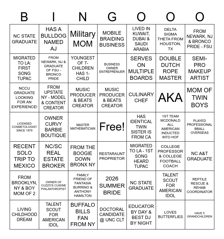 This bingo card has a free space and 48 words: NC STATE GRADUATE, DOUBLE DUTCH ROPE MASTER, DOCTORAL CANDIDATE @ UNC CLT, OWNER CURVY BARBIE BOUTIQUE, MUSIC PRODUCER & BEATS CREATOR, PLAYED PROFESSIONAL BBALL OVERSEAS, HAS A BULLDOG NAMED AJ, TALENT SCOUT FOR AMERICAN IDOL, DELTA SIGMA THETA FROM HOUSTON, TX, RESTARAUNT PROPRIETOR, FROM NEWARK, NJ & BRONCO PRIDE - FSU, MOBILE BRAIDING BUSINESS, AKA, CULINARY CHEF, FROM BROOKLYN, NY & BOY MOM OF 2, 1ST TEAM MCDONALD ALL AMERICAN INDUCTED INTO HOF, MIGRATED TO LA: FIRST SONG TUPAC, SEMI-PRO MAKEUP ARTIST, TALENT SCOUT FOR AMERICAN IDOL, LIVED IN KUWAIT, DUBAI & SAUDI ARABIA, SERVES ON MULTIPLE BOARDS, MASTER MATHEMATICIAN, NC STATE GRADUATE, FROM NEWARK, NJ & GRADUATE OF FSU - BRONCO PRIDE, REPTILE RESCUE & REHAB COORDINATOR, YOUNGEST OF 7-CHILDREN HAS 1-CHILD, MOM OF TWIN BOYS, LIVING CHILDHOOD DREAM, MUSIC PRODUCER & BEATS CREATOR, FROM UPSTATE NY - MODEL & CONTENT CREATOR, LOVES BUTTERFLIES, HAS IDENTICAL TWIN SISTER IS FROM CA, NC A&T GRADUATE, OWNER OF CUZZO'S CUISINE PHILANTHROPIST, LICENSED COSMETOLOGIST SINCE 1979, MIGRATED TO LA - 1ST SONG HEARD TUPAC, COLLEGE PROFESSOR & COLLEGE FOOTBALL COACH, NCCU GRADUATE LOOKING FOR AN EXPERIENCE!, FROM THE BOOGIE DOWN BRONX NY, FAMILY FRIEND OF FANTASIA BURRINO & ANTHONY HAMILTON, RECENT SOLO TRIP TO MEXICO, HAVE 5 GRANDCHILDREN, Military MOM, BUFFALO BILLS FAN FROM NY, BUSINESS OWNER ENTREPRENUER, 2026 SUMMER BRIDE, NC/SC REAL ESTATE BROKER and EDUCATOR BY DAY & BEST DJ BY NIGHT.