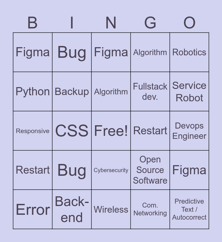 This bingo card has a free space and 67 words: Generative AI, Python, CSS, Figma, Cloud Technology, Fullstack dev., Bug, Restart, Algorithm, Com. Networking, Cybersecurity, Data Analytics, Devops Engineer, Robotics, Generative AI, Python, CSS, Figma, Cloud Technology, Fullstack dev., Bug, Restart, Algorithm, Com. Networking, Cybersecurity, Data Analytics, Devops Engineer, Robotics, Service Robot, Machine Learning, Predictive Text / Autocorrect, Recommendation System, Image Recognition AI, Natural Language Processing / NLP, Excel, Error, CPU, Open Source Software, Responsive, User Interface / UI, Software Tester / QA Tester, Backup, Restart, World Wide Web, Excel, Bug, Front-end, Back-end, Full stack dev., CSS, Figma, Microsoft Team, Cloud, Python, Microsoft Word, Wireless, Backup, Antivirus, Canva, Generative AI, Chatbot, Siri, Autocorrection, Tesla, DeepSeek, Google and Cybersecurity.