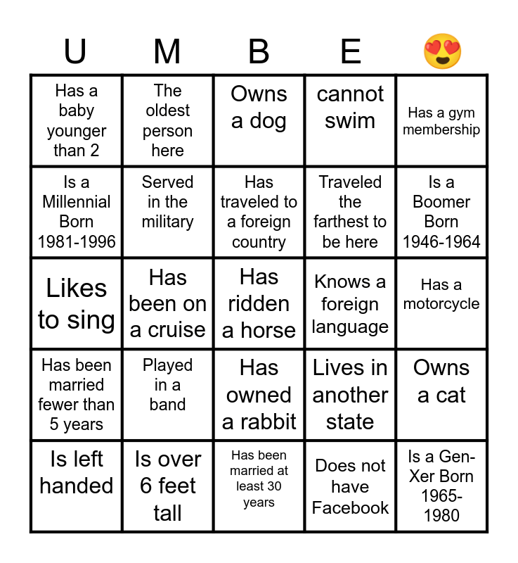 This bingo card has 25 words: Played in a band, Has been married at least 30 years, Has traveled to a foreign country, Is left handed, Has a gym membership, Has a baby younger than 2, Is a Millennial Born 1981-1996, The oldest person here, Knows a foreign language, Has owned a rabbit, Traveled the farthest to be here, Likes to sing, Lives in another state, Owns a cat, Served in the military, Is a Gen-Xer Born 1965-1980, Has a motorcycle, Owns a dog, Is a Boomer Born 1946-1964, Has been on a cruise, Has ridden a horse, Is over 6 feet tall, Has been married fewer than 5 years, cannot swim and Does not have Facebook.