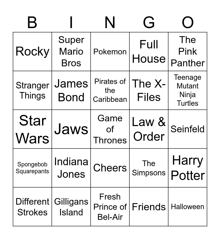 This bingo card has a free space and 24 words: Indiana Jones, Gilligans Island, Pirates of the Caribbean, Different Strokes, The Pink Panther, Rocky, Stranger Things, Super Mario Bros, Law & Order, Cheers, The X-Files, Star Wars, The Simpsons, Harry Potter, James Bond, Friends, Seinfeld, Pokemon, Teenage Mutant Ninja Turtles, Jaws, Halloween, Spongebob Squarepants, Full House and Fresh Prince of Bel-Air.