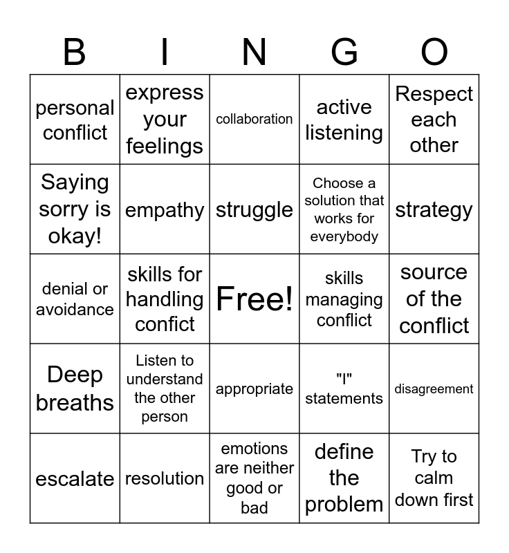 This bingo card has a free space and 24 words: Listen to understand the other person, resolution, struggle, escalate, Respect each other, personal conflict, Saying sorry is okay!, express your feelings, skills managing conflict, appropriate, Choose a solution that works for everybody, denial or avoidance, "I" statements, disagreement, empathy, define the problem, source of the conflict, collaboration, strategy, skills for handling confict, Try to calm down first, Deep breaths, active listening and emotions are neither good or bad.