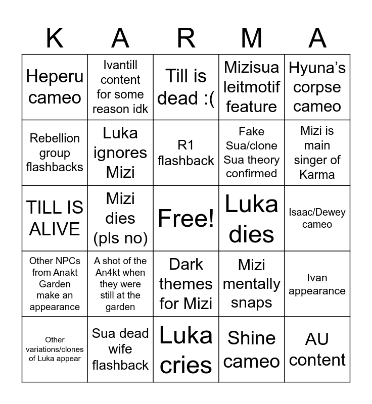 This bingo card has a free space and 24 words: A shot of the An4kt when they were still at the garden, Sua dead wife flashback, R1 flashback, Other variations/clones of Luka appear, Hyuna’s corpse cameo, Heperu cameo, Rebellion group flashbacks, Ivantill content for some reason idk, Luka dies, Dark themes for Mizi, Fake Sua/clone Sua theory confirmed, TILL IS ALIVE, Mizi mentally snaps, Ivan appearance, Luka ignores Mizi, Shine cameo, Isaac/Dewey cameo, Till is dead :(, Mizi is main singer of Karma, Mizi dies (pls no), AU content, Other NPCs from Anakt Garden make an appearance, Mizisua leitmotif feature and Luka cries.