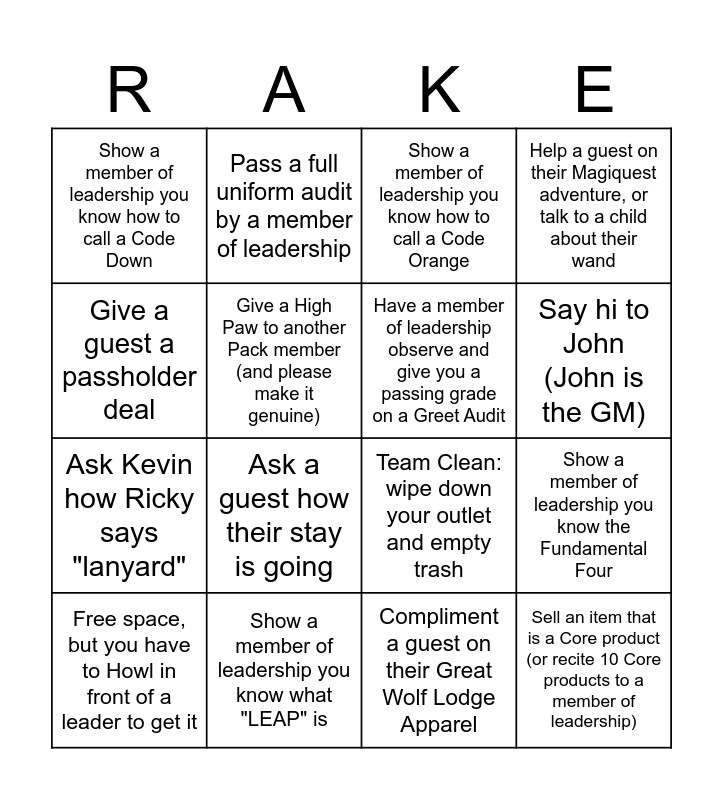 This bingo card has 16 words: Show a member of leadership you know what "LEAP" is, Show a member of leadership you know the Fundamental Four, Show a member of leadership you know how to call a Code Orange, Show a member of leadership you know how to call a Code Down, Ask Kevin how Ricky says "lanyard", Pass a full uniform audit by a member of leadership, Team Clean: wipe down your outlet and empty trash, Compliment a guest on their Great Wolf Lodge Apparel, Give a guest a passholder deal, Give a High Paw to another Pack member (and please make it genuine), Free space, but you have to Howl in front of a leader to get it, Help a guest on their Magiquest adventure, or talk to a child about their wand, Ask a guest how their stay is going, Say hi to John (John is the GM), Have a member of leadership observe and give you a passing grade on a Greet Audit and Sell an item that is a Core product (or recite 10 Core products to a member of leadership).