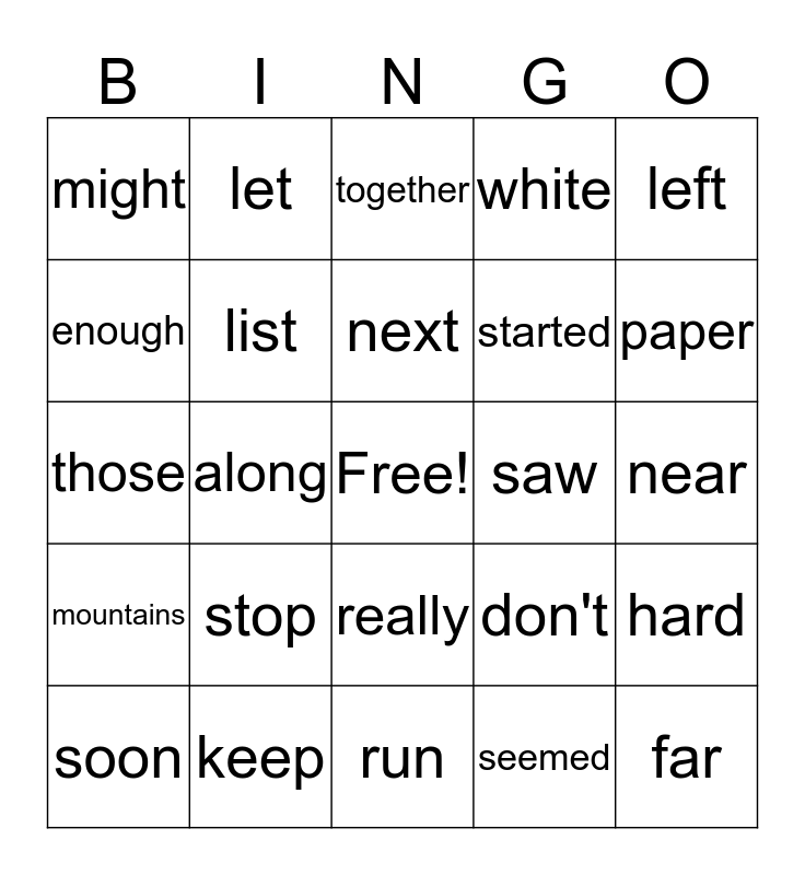 This bingo card has a free space and 100 words: high, every, near, add, food, between, own, below, country, plants, last, school, father, keep, trees, never, started, city, earth, eyes, light, thought, head, under, story, saw, left, don't, few, while, along, might, close, something, seemed, next, hard, open, example, beginning, life, always, those, both, paper, together, got, group, often, run, important, until, children, side, feet, car, miles, night, walked, white, sea, began, grow, took, river, four, carry, state, once, book, hear, stop, without, second, later, miss, idea, enough, eat, face, watch, far, Indians, really, almost, let, above, girl, sometimes, mountains, cut, young, talk, soon, list, song, being, leave, family and it's.