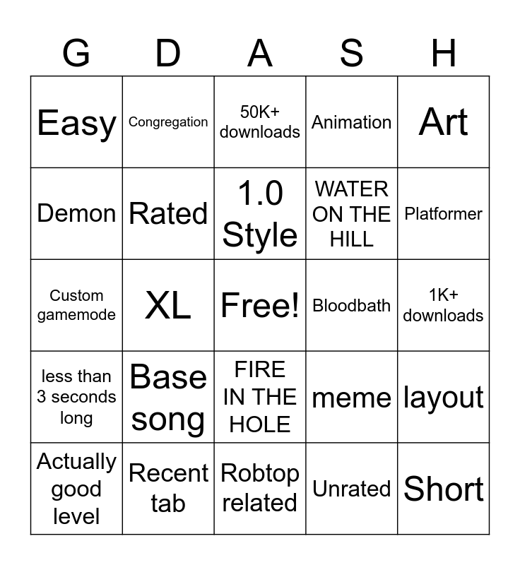 This bingo card has a free space and 24 words: Base song, Recent tab, 1.0 Style, Actually good level, Art, Easy, Demon, Congregation, Bloodbath, FIRE IN THE HOLE, WATER ON THE HILL, Custom gamemode, meme, layout, Rated, Unrated, 1K+ downloads, 50K+ downloads, Platformer, XL, Short, less than 3 seconds long, Animation and Robtop related.