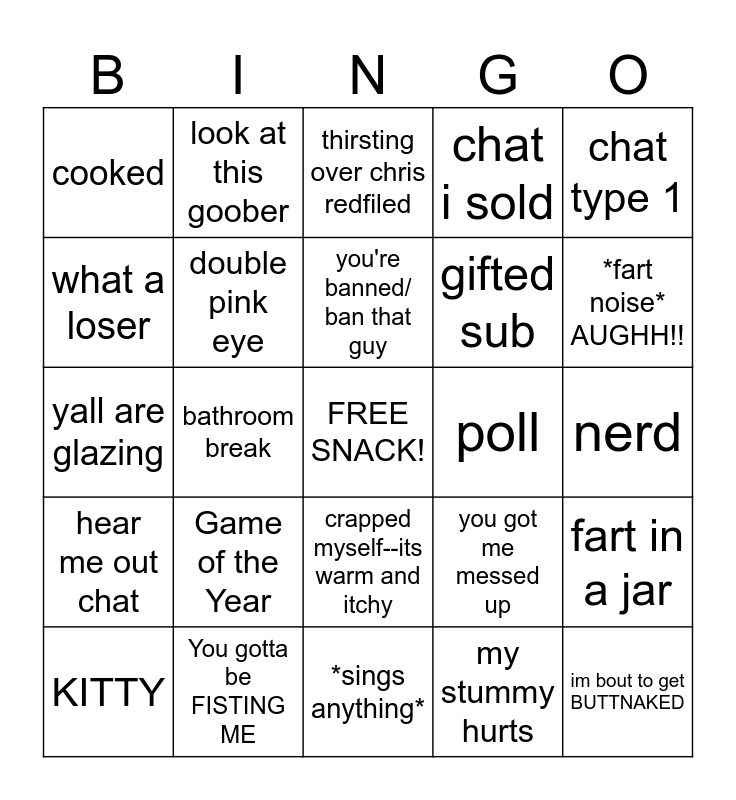 This bingo card has a free space and 24 words: Game of the Year, You gotta be FISTING ME, you're banned/ ban that guy, KITTY, chat type 1, cooked, what a loser, look at this goober, poll, crapped myself--its warm and itchy, gifted sub, yall are glazing, you got me messed up, fart in a jar, double pink eye, my stummy hurts, nerd, thirsting over chris redfiled, *fart noise* AUGHH!!, bathroom break, im bout to get BUTTNAKED, hear me out chat, chat i sold and *sings anything*.