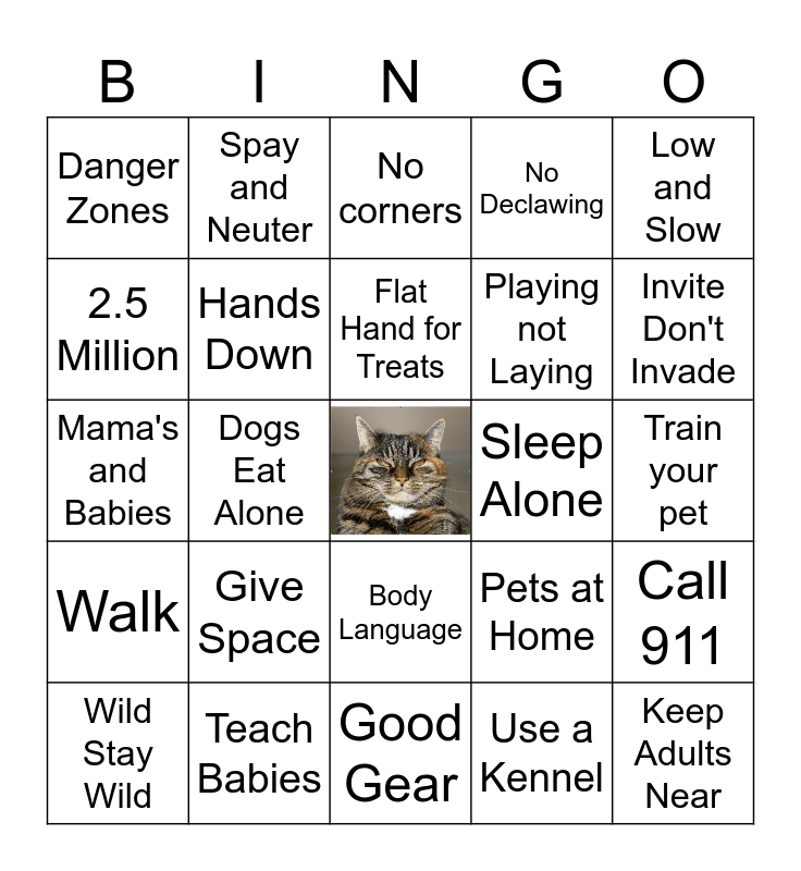 This bingo card has a free space and 32 words: Use a Kennel, No Retractable Leashes, Dogs Eat Alone, No face to face, Walk, Hands Down, Low and Slow, Call 911, Spay and Neuter, Vaccinate, Flat Hand for Treats, No corners, Close Gates, No Teasing, Sleep Alone, Microchip, Wild Stay Wild, Mama's and Babies, Body Language, Give Space, Pets at Home, Visit a Shelter, Train your pet, Teach Babies, Keep Adults Near, No Declawing, Playing not Laying, 2.5 Million, Danger Zones, Good Gear, Helmets Always and Invite Don't Invade.