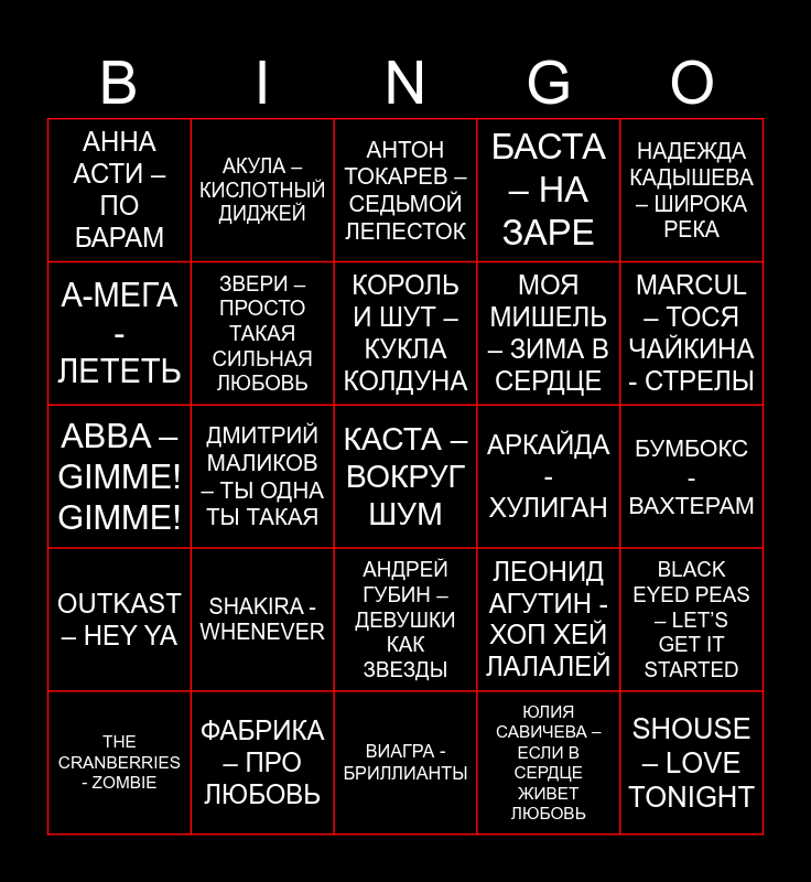 This bingo card has 28 words: BLACK EYED PEAS – LET’S GET IT STARTED, МЕЛАДЗЕ – КРАСИВО, МОЯ МИШЕЛЬ – ЗИМА В СЕРДЦЕ, ЮЛИЯ САВИЧЕВА – ЕСЛИ В СЕРДЦЕ ЖИВЕТ ЛЮБОВЬ, А-МЕГА - ЛЕТЕТЬ, АНТОН ТОКАРЕВ – СЕДЬМОЙ ЛЕПЕСТОК, АКУЛА – КИСЛОТНЫЙ ДИДЖЕЙ, OUTKAST – HEY YA, АРКАЙДА - ХУЛИГАН, THE CRANBERRIES - ZOMBIE, ABBA – GIMME! GIMME!, БАСТА – НА ЗАРЕ, ФАБРИКА – ПРО ЛЮБОВЬ, ВИАГРА - БРИЛЛИАНТЫ, MARCUL – ТОСЯ ЧАЙКИНА - СТРЕЛЫ, РУКИ ВВЕРХ – ОН ТЕБЯ ЦЕЛУЕТ, SHAKIRA - WHENEVER, ЗВЕРИ – ПРОСТО ТАКАЯ СИЛЬНАЯ ЛЮБОВЬ, КОРОЛЬ И ШУТ – КУКЛА КОЛДУНА, АНДРЕЙ ГУБИН – ДЕВУШКИ КАК ЗВЕЗДЫ, АННА АСТИ – ПО БАРАМ, SHOUSE – LOVE TONIGHT, КАСТА – ВОКРУГ ШУМ, ДМИТРИЙ МАЛИКОВ – ТЫ ОДНА ТЫ ТАКАЯ, БУМБОКС - ВАХТЕРАМ, ЛЕОНИД АГУТИН - ХОП ХЕЙ ЛАЛАЛЕЙ, НАДЕЖДА КАДЫШЕВА – ШИРОКА РЕКА and SHOUSE – WON’T FOGET YOU.