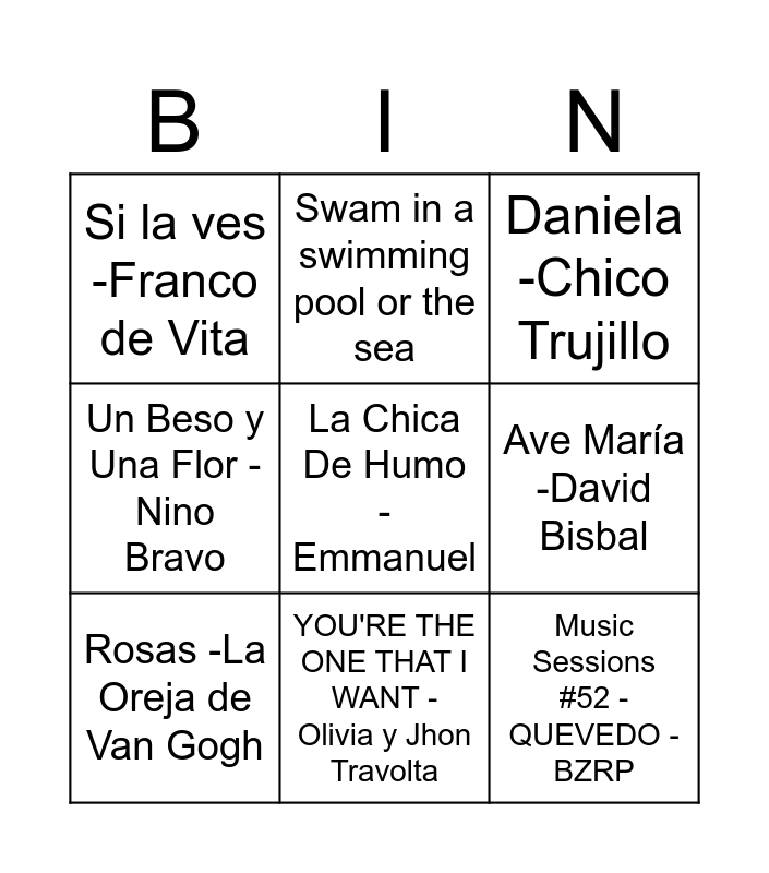 This bingo card has 129 words: Went on vacation to another country, Swam in a swimming pool or the sea, Stayed at home during the vacation, Read a book, Played video games, Played outside, Visited a (big) city, Went to bed after 11 PM, Slept in till 11 o'clock, Están Lloviendo Estrellas - Cristian Castro, Me vas a Extrañar - Damas Gratis, Olvídame y Pega La Vuelta - Pimpinela, Si Antes Te Hubiera Conocido - Karol G, Un Fin de -Ke Personajes, Dígale - David Bisbal, Con Otra - Cazzu, Nunca es Suficiente - Los Ángeles Azules - Natalia Lafourcade, Como la Flor - Selena, Mi Cama - Karol G, Y.M.C.A. - Village People, Mal Bicho - Los Fabulosos Cadillacs, Music Sessions #52 - QUEVEDO - BZRP, Piel - Tiago PZK- Ke Personajes, EL Merengue - Manuel Turizo, En las Malas y Buenas - Marcianeke, Pasarela - Nejo y Dalmata, Me Porto Bonito - Bad Bunny, Azul - Cristian Castro, Mami - Becky G - Karol G, Mueve lo que Dios te dio - Joel Music, Pepas - Farruko, Si una vez - Selena, Lo mejor de tu vida - Julio Iglesias, Tu amor de noche - Salvatore Adamo, Noa Noa - Juan Gabriel, Mátalas - Alejandro Fernández, Querida -Juan Gabriel, Dile - Don Omar, Sin Despertar - Kudai, Don - Miranda, La Playa - La Oreja de Van Gogh, Torero - Chayanne, Mil Pedazos - Christina y Los Subterráneos, Tu Falta de Querer - Mon Laferte, Y Yo Sigo Aquí - Paulina Rubio, Quieres Ser Mi Amante - Camilo Sesto, Solo Se Vive Una Vez - Azúcar Moreno, Mariposa Traicionera - Maná, La Cosa Más Bella - Eros Ramazzotti, Otra Como Tu - Eros Ramazzotti, Flaca - Andrés Calamaro, Mi Primer Millón - Bacilos, De Música Ligera - Soda Stereo, El Bahiano - Soledad, Nada Personal -Soda Stereo, El Baile de los Que Sobran - Los Prisioneros, Maldita Primavera - Yuri, Atrévete-te-te - Calle 13, La Mochila Azul - Pedro Fernández, Amante Bandido - Miguel Bosé, Pero Me Acuerdo De Ti -Christina Aguilera, Tal Vez -Ricky Martin, Culpable o No -Luis Miguel, Nada Fue Un Error - Coty y Andrés Calamaro, Bésame - Ricardo Montaner, Si la ves -Franco de Vita, Mujer Contra Mujer - Mecano, Cariño Malo - Palmenia Pizarro, Ahora Te Puedes Marchar - Luis Miguel, Ave María -David Bisbal, Labios Compartidos - Maná, Mi Primer Dia Sin Ti -Enanitos Verdes, Eligiendo Una Reina -Chancho En Piedra, Llueve sobre la ciudad -Los Bunkers, Mágico -Joe Vasconcellos, Si Me Amaras -Andrés de León, Déjame Llorar - Ricardo Montaner, Djobi Djoba - Gipsy Kings, Es Por Amor - G.I.T., María -Ricky Martin, Te Conozco Bien -Marc Anthony, La Chica De Humo -Emmanuel, Usted Se Me llevó La Vida - Alexandre Pires, Baño De Mar a Medianoche - Cecilia, YOU'RE THE ONE THAT I WANT - Olivia y Jhon Travolta, Entra En Mi Vida -Sin Banderas, Corazón -Los Auténticos Decadentes, La Guitarra -Los Auténticos Decadentes, Gotitas - Garras De Amor, Yo Tomo Vino y Cerveza - Amar Azul, Amor De Adolescentes - Grupo Red, Loca - Chico Trujillo, Sin Escusas -Chico Trujillo, Fuera De Mi Vida - Chico Trujillo, Corazón Partio - Alejandro Sanz, La Torre De Babel -Los Tres, Juego Verdadero -Tiro de Gracia, Daniela -Chico Trujillo, Rosas -La Oreja de Van Gogh, En El Muelle De San Blas -Maná, Celos - Daniela Romo, Un Beso y Una Flor -Nino Bravo, Beso a Beso -Paloma San Basilio, Mi Prisionera -Zalo Reyes, Ramito De Violetas -Zalo Reyes, Te Pareces Tanto a Él -Myriam Hernández, Bella Sin Alma -Ricardo Cocciante, Rata De Dos Patas -Paquita la del Barrio, Si Me Vas a Abandonar -Buddy Richard, Puré de Papas -Cecilia, María Teresa Y Danilo -Zalo Reyes, Caliente Caliente -Raffaella Carrà, Resistiré -Dúo Dinámico, Se fue - Laura Pausini, Dame Luz - Nicole, Azúcar Amargo - Fey, Tal vez Me Estoy Enamorando -Nicole, Ven Devórame Otra Vez - Azúcar Moreno, Ya No Hay Forma De Pedir Perdón - Pedro Aznar, El Me Mintió -Amanda Miguel, La Chica Del Bikini Azul - Luis Miguel, Que No Quede Huella -Los Broncos, Mientes -Camila, Limón y Sal -Julieta Venegas, Tractor Amarillo - Zapato Veloz, Quiero Ser Más Que Tu Amigo - Leo Rey, Piel Morena -Thalía, Yo Te Diré - Miranda and Teorema De Amor -Miguel Bosé.