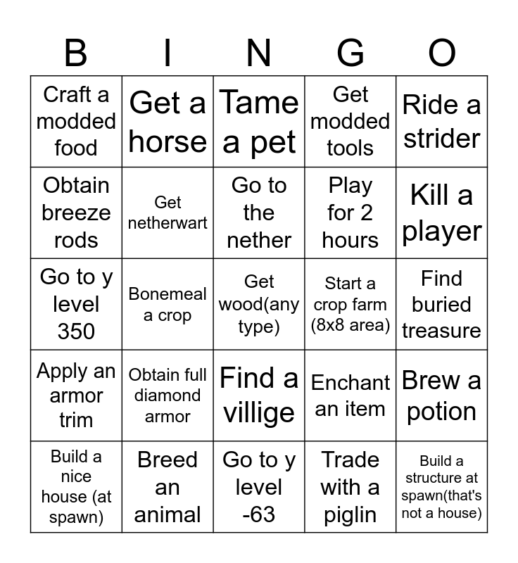 This bingo card has a free space and 24 words: Obtain full diamond armor, Breed an animal, Go to the nether, Build a nice house (at spawn), Ride a strider, Craft a modded food, Obtain breeze rods, Get a horse, Start a crop farm (8x8 area), Find a villige, Play for 2 hours, Go to y level 350, Enchant an item, Brew a potion, Get netherwart, Trade with a piglin, Find buried treasure, Tame a pet, Kill a player, Bonemeal a crop, Build a structure at spawn(that's not a house), Apply an armor trim, Get modded tools and Go to y level -63.