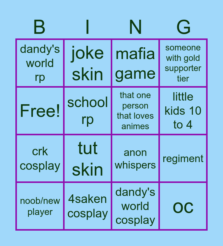 This bingo card has 16 words: 4saken cosplay, regiment, mafia game, dandy's world rp, crk cosplay, joke skin, anon whispers, dandy's world cosplay, Free!, school rp, noob/new player, someone with gold supporter tier, tut skin, little kids 10 to 4, that one person that loves animes and oc.