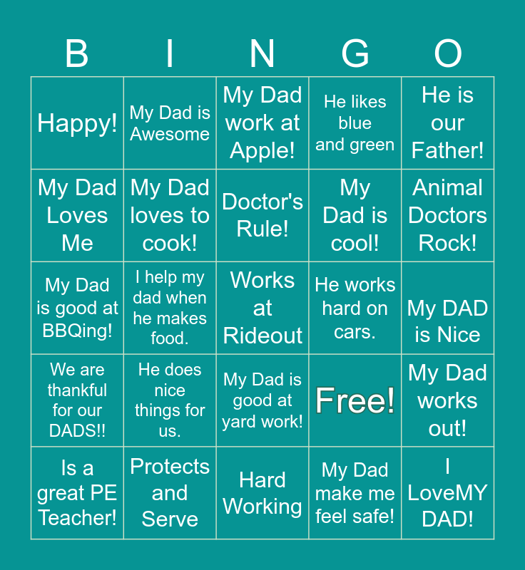This bingo card has 25 words: He does nice things for us., Hard Working, Doctor's Rule!, Is a great PE Teacher!, He is our Father!, Happy!, My Dad Loves Me, My Dad is Awesome, He works hard on cars., My Dad is good at yard work!, My Dad is cool!, My Dad is good at BBQing!, Free!, My Dad works out!, My Dad loves to cook!, I LoveMY DAD!, My DAD is Nice, My Dad work at Apple!, Animal Doctors Rock!, I help my dad when he makes food., Works at Rideout, Protects and Serve, We are thankful for our DADS!!, He likes blue and green and My Dad make me feel safe!.