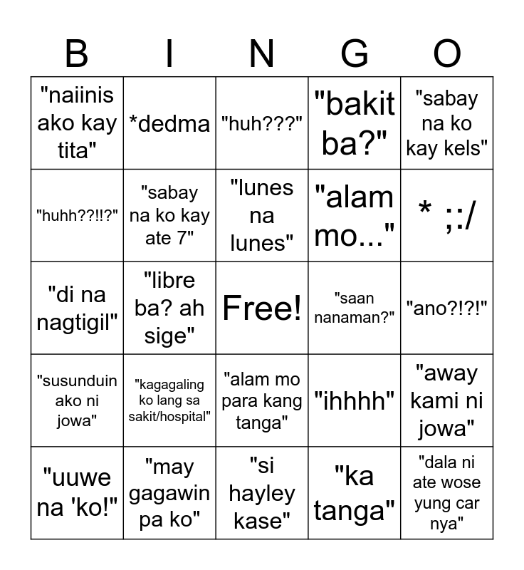 This bingo card has a free space and 24 words: "uuwe na 'ko!", "kagagaling ko lang sa sakit/hospital", "lunes na lunes", "ka tanga", "sabay na ko kay kels", "naiinis ako kay tita", *dedma, "huh???", "saan nanaman?", "ano?!?!", "di na nagtigil", "sabay na ko kay ate 7", "ihhhh", "away kami ni jowa", "huhh??!!?", "may gagawin pa ko", "si hayley kase", "bakit ba?", * ;:/, "susunduin ako ni jowa", "libre ba? ah sige", "alam mo para kang tanga", "alam mo..." and "dala ni ate wose yung car nya".