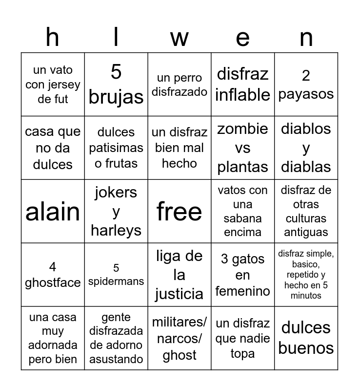 This bingo card has a free space and 24 words: 5 spidermans, gente disfrazada de adorno asustando, un disfraz bien mal hecho, una casa muy adornada pero bien, 2 payasos, un vato con jersey de fut, casa que no da dulces, 5 brujas, vatos con una sabana encima, liga de la justicia, zombie vs plantas, alain, 3 gatos en femenino, disfraz simple, basico, repetido y hecho en 5 minutos, dulces patisimas o frutas, un disfraz que nadie topa, disfraz de otras culturas antiguas, un perro disfrazado, diablos y diablas, jokers y harleys, dulces buenos, 4 ghostface, disfraz inflable and militares/ narcos/ ghost.