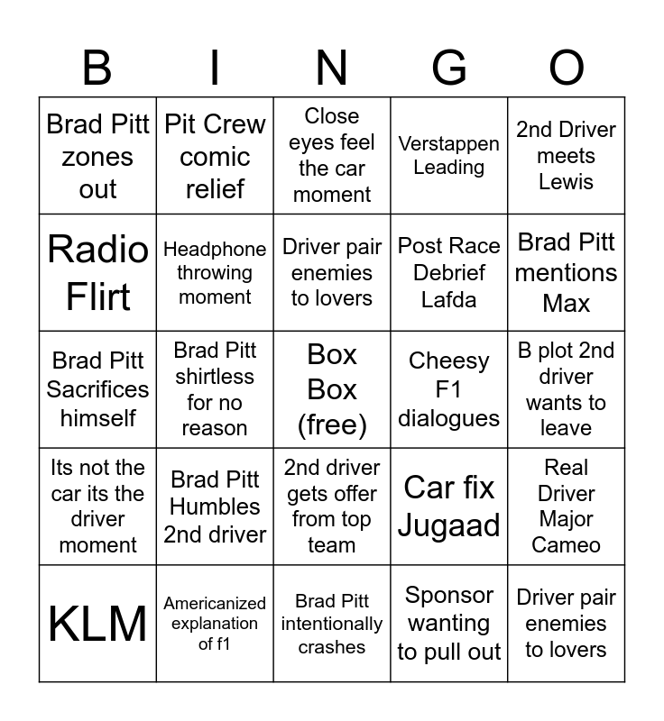 This bingo card has a free space and 24 words: Brad Pitt Humbles 2nd driver, Americanized explanation of f1, Driver pair enemies to lovers, KLM, 2nd Driver meets Lewis, Brad Pitt zones out, Radio Flirt, Pit Crew comic relief, Cheesy F1 dialogues, 2nd driver gets offer from top team, Post Race Debrief Lafda, Brad Pitt Sacrifices himself, Car fix Jugaad, Real Driver Major Cameo, Headphone throwing moment, Sponsor wanting to pull out, B plot 2nd driver wants to leave, Close eyes feel the car moment, Brad Pitt mentions Max, Brad Pitt shirtless for no reason, Driver pair enemies to lovers, Its not the car its the driver moment, Verstappen Leading and Brad Pitt intentionally crashes.