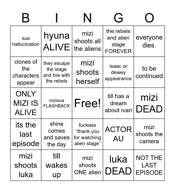 This bingo card has a free space and 24 words: shine comes and saves the day, till wakes up, mizi shoots herself, mizi shoots luka, everyone dies., sua hallucination, clones of the characters appear, hyuna ALIVE, till has a dream about ivan, fuckass “thank you for watching alien stage”, isaac or dewey appearance, ONLY MIZI IS ALIVE, ACTOR AU, mizi shoots the camera, they escape the stage and live with the rebels, luka DEAD, mizi DEAD, mizi shoots all the aliens, to be continued, mizisua FLASHBACK, NOT THE LAST EPISODE, its the last episode, the rebels end alien stage FOREVER and mizi shoots ONE alien.