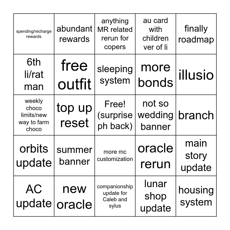 This bingo card has a free space and 24 words: summer banner, new oracle, sleeping system, AC update, finally roadmap, spending/recharge rewards, 6th li/rat man, abundant rewards, not so wedding banner, more mc customization, more bonds, weekly choco limits/new way to farm choco, oracle rerun, main story update, free outfit, lunar shop update, branch, anything MR related rerun for copers, illusio, top up reset, housing system, orbits update, au card with children ver of li and companionship update for Caleb and sylus.